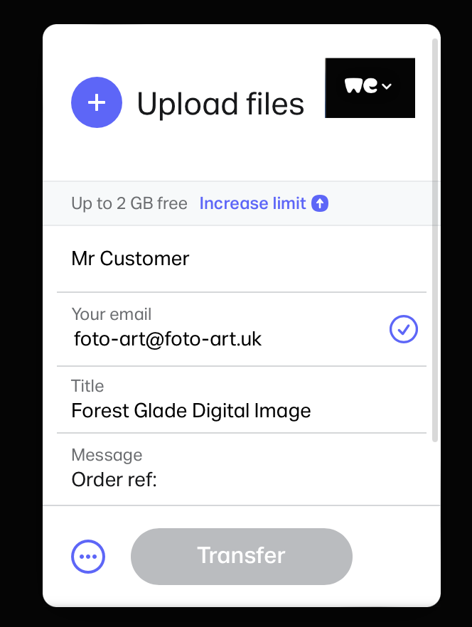 Digital Files will be delivered using WeTransfer. This is a free service and allows Hi-Res files to be sent direct to your email address for instant download; multiple files can be sent in one email.